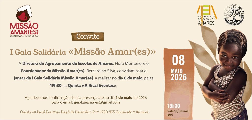 A Diretora do Agrupamento de Escolas de Amares, Flora Monteiro, e o coordenador da Missão Amar(es), Bernardino Silva, convidam para o jantar da Gala Solidária Missão Amares, a realizar no dia 8 de maio, pelas 19:30h na Quinta “A Rival Eventos” em Figueiredo, Amares.